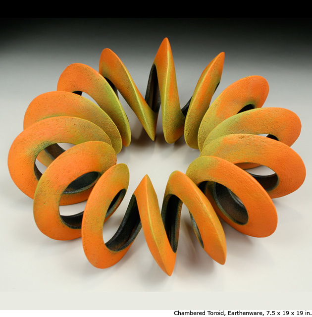 "Mary Roettger likes pinecones, Slinkies, and nautilus shells. The common denominator: pattern, and in particular spirals. A pinecone's seeds are arranged according to a pair of intersecting s-curves. With the spirals, as the Slinkies suggest, there is a sense of movement, the dynamism of curves in the process of uncoiling, releasing energy and revealing the form.